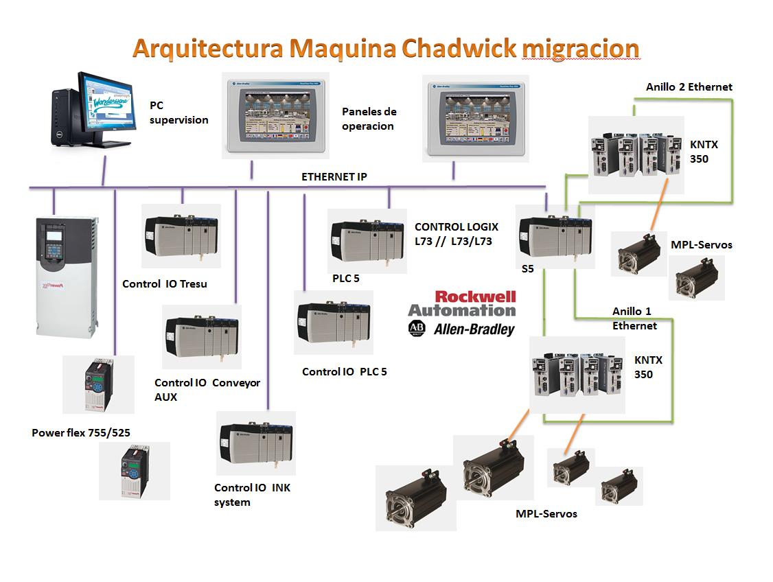 Por medio de los equipos de arquitectura integrada de Rockwell Automation-Allen Bradley, integrando el sistema de control , variación de velocidad y control de posición en una única plataforma de control, la cual consistió en un PLC Control logix, L73 con Control IO distribuido, paneles de Operación Panel View plus 6, Variadores de velocidad Powerflex 525 y 755, y Servo Drives Kinetix 350 todo integrado a través de redes Ethernet/IP (anillo y estrella). Se elimina asi el problema que conlleva tener controladores de diferentes familias y control de posición con motores paso a paso (Steppers) a los cuales es difícil realizarle diagnostico.